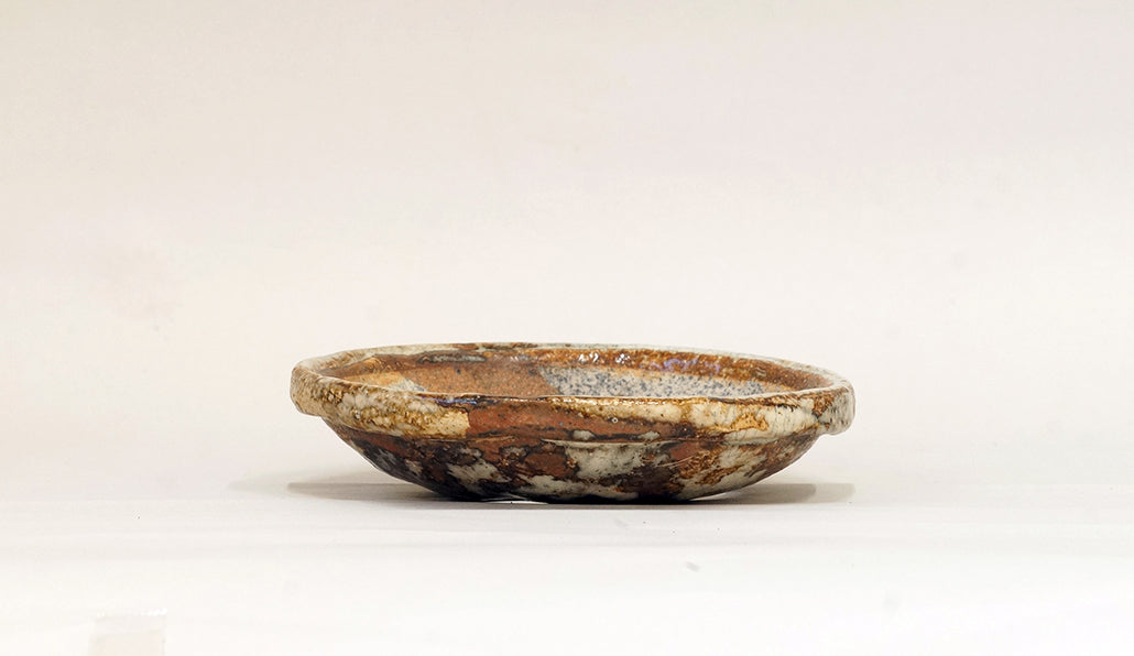 ・焼締めの鉢に白と透明の釉薬がかかり、面白い模様が生まれています。