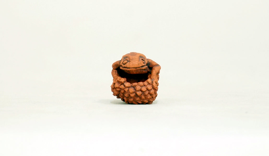 ・蛙の小さなオブジェ、もしくは盆栽の展示に添えられる添配(てんぱい)のように見えますが、とても小さな鉢です。底には3ミリほどの穴が空いています。