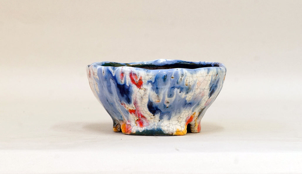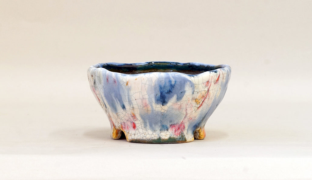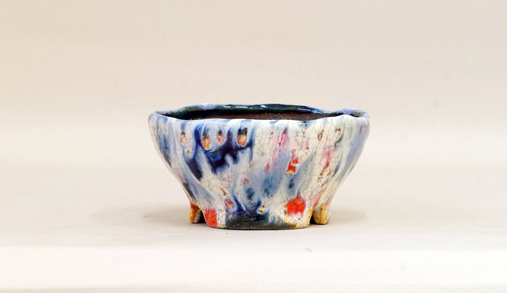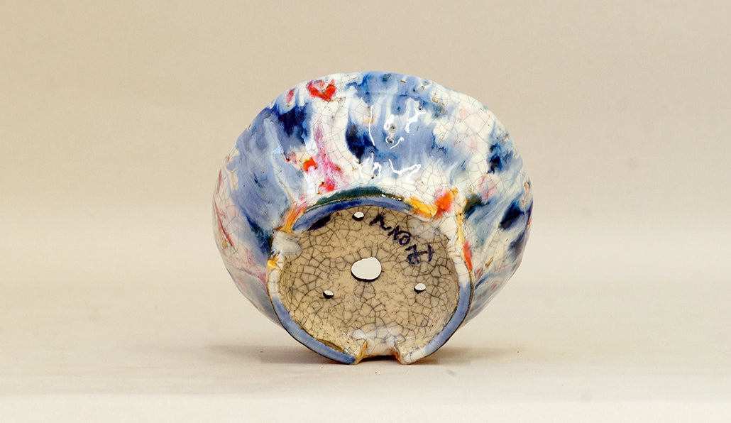 作り手:てるみ。福井の越前焼産地で盆栽鉢を作り続ける女性の作家です。手びねりで、毎日一つずつ作陶しています。鮮やかで美しい釉色の鉢が多く、見ていると気持ちまで明るくなります。「植物に合わせるには強すぎないか?」と思う色もありますが、不思議と美しく調和します。旦那さんは、越前文山さんです。