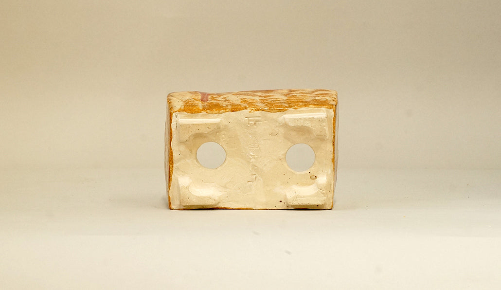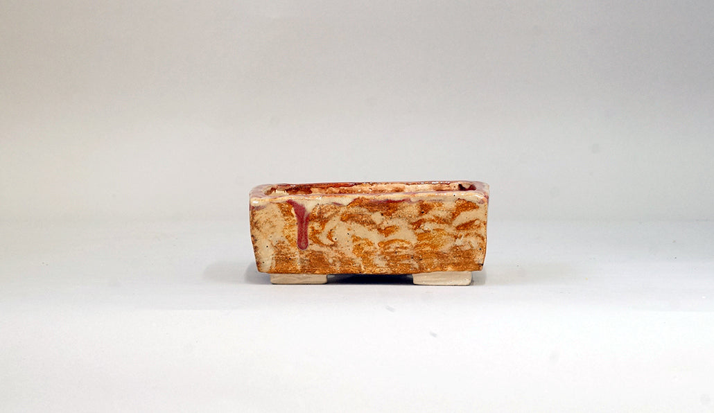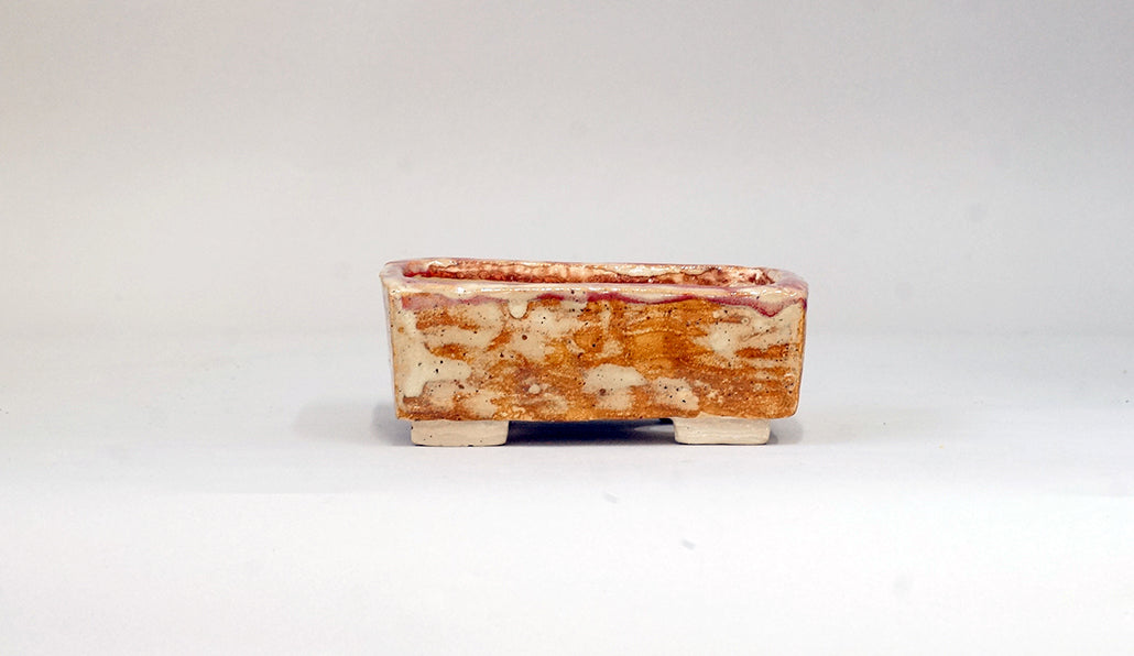 ・ベージュ、ピンク、明るいブラウンの釉色が折り重なって見えます。